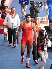 Nick Matuhin (born as Nikita Matuhin Russian: Никита Матюхин on 5 April 1990 in Moscow, Russian SFSR, Soviet Union) is an amateur German freestyle wrestler, who competed in the men's super heavyweight category.[1][2] He is currently a member of SC Luckenwalde in Luckenwalde, Brandenburg, and is coached and trained by four-time Olympian Alexander Leipold.[3] Matuhin stands 1.98 metres (6 ft 6 in) tall, and weighs 120 kilograms (265 lb).[1]