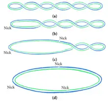 The diagram shows the effects of nicks on intersecting DNA in a twisted plasmid. Nicking can be used to dissipate the energy held up by intersecting states. The nicks allow the DNA to take on a circular shape.[2]