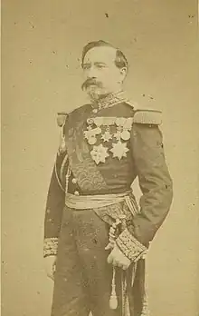 Charles-Denis Sauter Bourbaki was born on 22 April 1816 in Pau, Basses-Pyrénées, now Pyrénées-Atlantiques, France, to a family of Greek origin. He became a successful general during the era of Napoleon III, serving in the Crimean War and other conflicts. During the Franco-Prussian war however, Charles-Denis Bourbaki suffered a major defeat. At the time of the Siege of Metz, he was lured to Britain on false pretenses of a peace conference, and upon return to the continent he was tasked with lifting the Siege of Belfort, an effort which failed. Charles-Denis Bourbaki was forced to retreat with his army—the Armée de l'Est—across the Swiss border. The force was disarmed by the Swiss, and the general unsuccessfully attempted suicide. Charles-Denis Bourbaki later died on 27 September 1897, and the dramatic story of his defeat entered the French consciousness.[8][9]