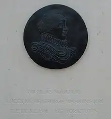 Statue of George Washington, with a medallion of his ancestor from Île de Ré, Nicolas Martiau.