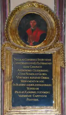 Copernicus was reportedly buried in Frombork Cathedral, where a 1580 epitaph stood until being defaced; it was replaced in 1735. For over two centuries, archaeologists searched the cathedral in vain for Copernicus's remains. Efforts to locate them in 1802, 1909, 1939 had come to nought. In 2004 a team led by Jerzy Gąssowski, head of an archaeology and anthropology institute in Pułtusk, began a new search, guided by the research of historian Jerzy Sikorski.[61][62] In August 2005, after scanning beneath the cathedral floor, they discovered what they believed to be Copernicus's remains.[63]