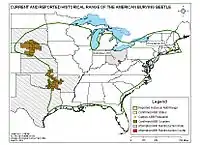Historical records show that this beetle once lived in 35 states and the District of Columbia in the United States, and the provinces of Ontario and Quebec in Canada.[5][6] Currently, natural populations are known to occur in only ten states: Rhode Island (Block Island), Oklahoma, Arkansas, Texas, Kansas, South Dakota, and Nebraska; they have been reintroduced to Ohio, Massachusetts, and Missouri.[7]