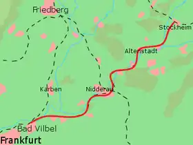 After a grade-separated crossing of the Friedberg–Hanau railway in Nidderau station, which was called Heldenbergen-Windecken for decades, the line follows the Friedberg–Hanau railway briefly, before turning towards Altenstadt. After a short section through a forest, it runs over a low embankment through an area that is subject to flooding by the Nidder to reach the forest again in Eichen. After a crossing of the Nidder before Höchst, the line soon reaches Altenstadt. Until about 1990, an industrial railway branched there to Waldsiedlung, which was three kilometres away. Less than an hour after leaving Bad Vilbel, after running through some meadows and crossing the Nidder again, the line finally reaches Glauburg and the station at the end of the line in the suburb of Stockheim where it meets the Gießen–Gelnhausen railway. Here it is the possible to continue towards Giessen or Gelnhausen.