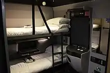It usually consists of seven air-conditioned Mark 3 carriages,[25] but is eight from Paddington on a Friday night, and from Penzance on a Sunday night. Coaches A and B are seated coaches, C is the Buffet/Lounge Car and the rest are sleeping cars. There are wheelchair spaces in coaches B and D. The sleeping cars are generally made up as six single compartments, and six double in each coach. However this can be altered if demand dictates. Passengers pay standard fares with a supplementary charge for a sleeping berth (a single berth is more expensive per person than twin bunk berths).[32] Alternatively, they can purchase a berth inclusive fare. The coaches have not often been used on any other services. However, on summer Saturdays from 2015 until 2018 the seating coaches from a Night Riviera set operated a daytime service from St Erth to Exeter St Davids and back to Penzance.[33][34] Additionally, a Night Riviera set operated a service to Oxford in February 2010.[35]