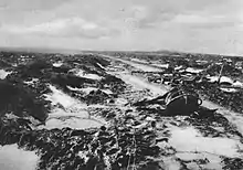 Behind a Vorfeldlinie (outpost line) an outpost zone 500–1,000 yd (460–910 m) deep, was occupied by a few sentries and machine-guns. When the British attacked, the troops in the Vorfeldlinie and the outpost zone were swiftly to retire to the main line of resistance (Hauptwiederstandslinie) and the artillery was quickly to bombard the Vorfeldlinie. The rear battalions of the ground-holding divisions (Stellungsdivisionen) and their Eingreif division would advance to the Hauptwiederstandslinie and conduct a Gegenstoß; if this was impossible, a Gegenangriff (methodical counter-attack) would be substituted, after taking 24–48 hours to arrange the co-ordination of infantry, artillery and aircraft.[6] The length of front held by a Stellungsdivision was reduced by half to 2,500 yd (2,300 m) with a depth of 8,000 yd (4.5 mi; 7.3 km), because of the difficulties caused by the weather, devastating British artillery-fire and German infantry casualties. Infantry battalions were relieved after two days and the divisions every six days.[7] The Vorfeldzonelinie concept was soon altered because the British were able to pick off isolated outposts lift prisoners. A Sicherungslinie (safety line), to be retired to at night, was built to stop the British raiding the Vorfeldzonelinie. The Hauptwiderstandslinie was about 400 yd (370 m) further back comprising fortified farms, pillboxes, blockhouses and shell craters. (The Vorfeldzone around Passchendaele was captured by the Canadian Corps on 10 November and the Hauptwiderstandslinie perforce became a linear defence, protecting the eastern slope of Passchendaele Ridge.)[8]