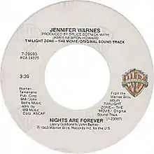 "Nights Are Forever" is a song written by composer Jerry Goldsmith and lyricist John Bettis that was produced by James Newton Howard and performed by Jennifer Warnes for the 1983 anthology film Twilight Zone: The Movie.[2] The single became the follow-up to her duet with Joe Cocker, "Up Where We Belong". "Nights Are Forever" is heard very briefly during the jukebox scene in the segment of the film that was written and directed by John Landis and starred Vic Morrow.