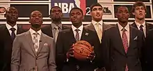 Irving announced that he would forgo his final three seasons of eligibility and enter the 2011 NBA draft, where he was selected with the first overall pick by the Cleveland Cavaliers.[38][39] Irving was named to the 2012 Rising Stars Challenge, where he played for Team Chuck. Irving scored 34 points in the game, going 8-of-8 from three-point range, and earned MVP honors.[40] He also won the 2012 NBA Rookie of the Year Award with 117 of a possible 120 first-place votes.[41] He was the only unanimous selection to the NBA All-Rookie First Team.[42] For the season, Irving averaged 18.5 points, 5.4 assists and shot 46.9% from the field, including 39.9% on three-pointers.[43]