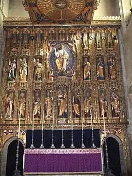 After a number of restorations and embellishments of existing buildings, Comper's first completed commission for an entirely new church was St Cyprian's, Clarence Gate, London[11] which sought to put into practice the precepts of the Alcuin Club, with whose liturgical views he remained closely identified. The warm reception afforded to St Cyprian's rapidly led to an increase in commissions. These included a range of windows in the north wall of the nave of Westminster Abbey; a baldacchino/ciborium, high altar and east window in memory of the dead of the Great War at St Peter's Church, Huddersfield;[12] the Church of St Mary the Virgin, Wellingborough;[13] St Michael & All Angels, Inverness;[14] the Lady Chapel at Downside Abbey, Somerset;[15] the ciborium and House Chapel extension for the Society of St. John the Evangelist in Oxford (now St Stephen's House, Oxford);[16] the Lady Chapel at St Matthew's, Westminster;[17] the Lady Chapel and gilded paintings in the chancel of All Saints, Margaret Street;[18] and St Martin's Chapel (1913) at Chailey Heritage School, with his son Sebastian.[19] He also designed the main building for infants for St Mary & St John School on Hertford Street in Oxford, now the Comper Foundation Stage School.[20] Comper also completely restored and partially redesigned the church at Church of St Giles, Wimborne St Giles, Dorset, which suffered near total destruction following a fire in 1908.[21]