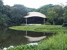 A manmade lagoon is situated within the grounds of the Ninoy Aquino Parks and Wildlife Center which hosts various fishes including catfish, tilapia, and snakehead.[5] Other facilities can also be found within the immediate vicinity of the lagoon. This includes: the Fishing Village which consists of five houses on stilts situated on water along the edge of the lagoon and is patterned after structures often found in fishing villages in Mindanao[6] and a 500–600 capacity open-air amphitheater.[7]
