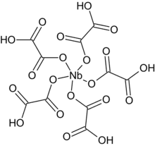 Niobium(V) can form complexes with hydroxy acids, as well as oxalic acid. The salt formed is more complex than tartaric acid for niobium (as opposed to tantalum).[3] NH4[NbO(C2O4)2(H2O)2]·3H2O starts to lose water at 125°C, and at 630°C, it fully decomposes, forming a compound known as niobium pentoxide;[4] Heating this complex and sodium citrate at 650°C can form sodium niobate (NaNbO3).[5]