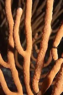 This fan is short and pale cream to orange in colour. It grows upright or in bushy masses, with irregular or frequent branches coming off the main basal stem. The branches are covered on all sides with many small bumps from which the polyps extend. It may grow up to 18 cm tall and have branches of 0.2 to 0.4 cm wide.[3]