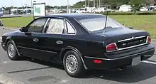 In October 1989 the third-generation President, designated JHG50, debuted at the Tokyo Motor Show, with sales beginning a year later. Concurrently, a short-wheelbase version of the chassis debuted in the United States as Infiniti Q45 or Nissan Infiniti Q45 in Japan, with a different front and rear end — in response to the 1989 Lexus LS and the 1985 Acura Legend. Renewed emphasis sought to position the President as a top-level luxury limousine, with high levels of standard equipment, including Connolly Leather or wool and silk upholstery. Extras included a diamond inlay on the key, gold plate hood ornament and rear badging, and ultra sound massage in the rear seats.[5] This time the vehicle adopted many European styling cues, with its front now resembling the contemporary Jaguar XJ. Unlike the previous, hand-made generations, this was the first President built on an assembly line.[2]