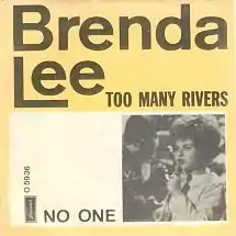 In 1965, Brenda Lee covered "No One," with chorus and orchestra directed by Owen Bradley. It was released as an A-side, however, it was backed with "Too Many Rivers," which became the bigger hit (#13).[1] Her rendition reached only #98 on the U.S. Billboard Hot 100.[2] Nevertheless, it also reached #25 on the U.S. Easy Listening chart, and was the only version of the song to chart in Canada, where it became a Top 40 hit (#36).[4]