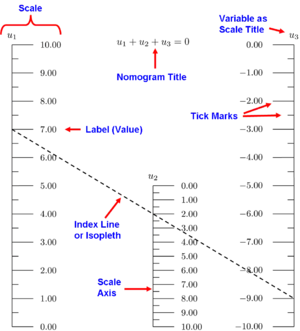 A nomogram for a three-variable equation typically has three scales, although there exist nomograms in which two or even all three scales are common. Here two scales represent known values and the third is the scale where the result is read off. The simplest such equation is u1 + u2 + u3 = 0 for the three variables u1, u2 and u3. An example of this type of nomogram is shown on the right, annotated with terms used to describe the parts of a nomogram.