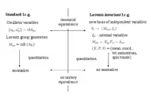 Algebraically this corresponds to a canonical transformation ai -> bi in the classical mechanics to a new set of variables, explicitly containing all necessary generators of symmetries. For the standard light cone gauge the Lorentz generators Mμν are cubic in terms of oscillator variables ai, and their quantization acquires well known anomaly. Consider a set bi = (Mμν,ξi) which contains the Lorentz group generators and internal variables ξi, complementing Mμν to the full phase space. In selection of such a set, one needs to take care that ξi will have simple Poisson brackets with Mμν and among themselves. Local existence of such variables is provided by Darboux's theorem. Quantization in the new set of variables eliminates anomaly from the Lorentz group. Canonically equivalent classical theories do not necessarily correspond to unitary equivalent quantum theories, that's why quantum anomalies could be present in one approach and absent in the other one.