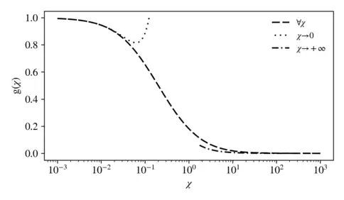 When the incoming field is very intense , the interaction of the electron with the electromagnetic field is completely equivalent to the interaction of the electron with multiple photons, with no need of explicitly quantize the electromagnetic field of the incoming low-energy radiation.[5] While the interaction with the radiation field, i.e. the emitted photon, is treated with perturbation theory: the probability of photon emission is evaluated considering the transition between the states of the electron in presence of the electromagnetic field.[5] This problem has been solved primarily in the case in which electric and magnetic fields are orthogonal and equal in magnitude (crossed field); in particular, the case of a plane electromagnetic wave has been considered.[8] [5] Crossed fields represent in good approximation many existing fields so the found solution can be considered quite general.[5] The spectrum of non-linear inverse Compton scattering, obtained with this approach and valid for and , is:[28]