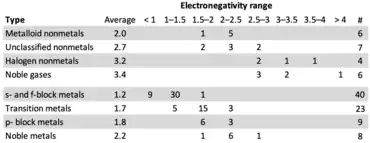 | Electronegativity[76] | Low to high | Moderate to very high |