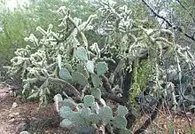 O. ficus-indica thrives in regions with mild winters having a prolonged dry spell followed by hot summers with occasional rain and relatively low humidity.[1] A mean annual rainfall of 350–500 mm (14–19+12 in) provides good growth rates.[1] O. ficus-indica proliferates in various soils ranging from subacid to subalkaline, with clay content not exceeding 15–20% and the soil well-drained.[1] The shallow root system enables the plant to grow in shallow, loose soils, such as on mountain slopes.[1] Opuntia spreads into large clonal colonies, which contribute to its being considered a noxious weed in some places.[1][6]