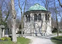 The imposing cemetery buildings include a chapel, a mortuary and a burial wall, which was designed between 1896 and 1899 by the municipal architect Hans Grässel. In 1962 a columbarium was added to the north by the architect Eugen Jacoby.