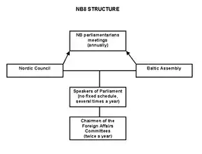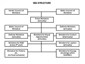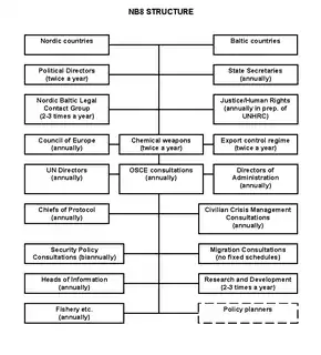 On the political level, co-operation in the NB8 format is conducted primarily in the form of annual meetings of the Prime Ministers and Foreign Ministers. The Foreign Ministers' meetings have taken place since 1993. In addition to the foreign ministers and prime ministers, other ministers and ministry officials also meet on a regular basis. In the realm of foreign policy, there are many meetings held in addition to the annual meeting of the foreign ministers. The secretaries general, political directors, and experts in various fields from the foreign ministries also get together regularly, and there are frequent meetings of diplomats in foreign representations within the NB8 format.[15]