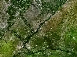 Like most of Botswana, it consists of partially dissected tablelands, in this case sloping down from the Kaukau Veld that lies to the northwest.[8] This flow and the Okavango River drain into the mostly endorheic Okavango Delta. The delta seasonally overflows into the endorheic Lake Ngami to the south, and into the Thamalakane River which via the Boteti River feeds the Makgadikgadi salt pans to the southeast.[9] Most of the rivers in the region are seasonal, and subject to flash floods.[10] Maun, the Tsodilo Hills, Moremi Game Reserve, Gchwihaba (Drotsky's) Caves, Aha Hills, Nhabe Museum and Maun Educational Park are the major tourist attractions in the district.