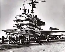 This proposal, which was referred to the North American General Purpose Attack Weapon (NAGPAW) concept, was promptly evaluated by the United States Navy.[5] The service produced numerous challenging demands, including the somewhat contradictory necessity of both a high speed of Mach 2 and the ability to take off from an aircraft carrier at maximum weight with no head-wind, also known as wind-over-the-deck, to assist the take-off. Compton's team were able to reconcile these performance requirements into the design.[5] Following these changes, US Navy officials voiced their approval of the design and advocated for its procurement.[7] During July 1955, an initial design contract, which included the production of a mockup, was issued to NAA. During September 1956, a follow-on contract for the production of a pair of flight-worthy prototypes, was awarded to the firm.[5]