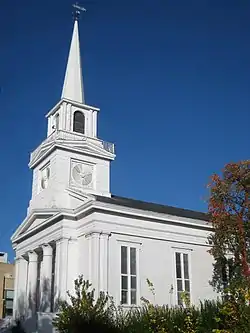 The building's simple, rectangular plan was originally four bays deep with a tall, multi-stage spire surmounting a projecting entrance portico; it then resembled Charles Bulfinch's New South Church in Boston (1814) though in Greek Revival form with Egyptian columns. The addition of a chancel and transepts in 1872 created a cruciform plan. The original three-stage tower and spire, similar to that of the New South Church, was damaged in a storm, and in 1906 its upper two round stages and spire were replaced with a square belfry and a copper dome. Today's eight-faceted spire was built in 1964 after the dome was struck by lightning and caught fire, and now only the pedimented first stage of the original steeple remains.[4]