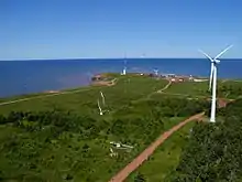 The North Cape Wind Farm is a small 16-turbine wind farm located at North Cape in the community of Seacow Pond, immediately south of the WEICan facility. The wind farm was developed in two 8-turbine phases with phase one being completed in November 2001 and phase two being completed in November 2003. The wind turbines being used are the Vestas V-47-660 model with a rated generating capacity of 660 kWh (2,400 MJ).[12] At 100% production, the 16 turbines are capable of generating 10.5600 MWh (38,016 MJ) of electrical power per year.[13]