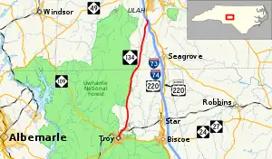 NC 134 is a predominantly two-lane rural highway that begins in downtown Troy at the intersection of North Main Street and East Main Street. Going north, it travels next to Denson Creek Golf Course before becoming the eastern edge of the Uwharrie National Forest. A couple of times the national forest goes over the eastern side of the road but not many. At Beane Country Road, the Uwharrie Forest finally goes west of the road as the road continues north. At Dawson Miller Road, NC 134 ends, just 600 feet (180 m) from the I-73/I-74/US 220 interchange.