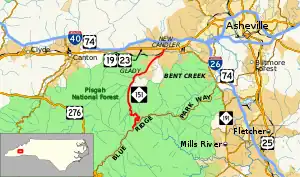 NC 151 has its southern end at the Blue Ridge Parkway near Mount Pisgah and briefly parallels the parkway for the first two miles (3.2 km) before turning west. Shortly after, NC 151 turns back north. NC 151 travels north, passing through Stony Fork then South Hominy as it turns northeast. NC 151 also passes through Glady before reaching the unincorporated community of Candler as it nears its end. At 11.83 miles (19.04 km), NC 151 reaches its northern terminus at U.S. Route 19 (US 19) and US 23 (Smokey Park Highway) in Enka.[1][2]