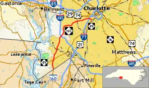 Established in 1942 as a new primary routing, NC 160 was a mere 2 miles (3.2 km), connecting NC 49 to SC 160 on the South Carolina state line. Before its establishment, it was a secondary road connecting to then SC 211 (1939–1942).[2][3] Between 1956–58, NC 160 was extended north along Steele Creek Road and Morris Field Drive to Wilkinson Boulevard (US 29/US 74). In 1967, NC 160 was rerouted east along West Boulevard to its current north terminus at NC 49 near Uptown Charlotte. In the late-1970s, the section near the Charlotte Douglas Airport was moved slightly south to allow airport expansion.[4][5] Another relocation around a new Norfolk Southern intermodal facility yard near the Charlotte Douglas Airport was constructed between 2010 and 2012.[6]