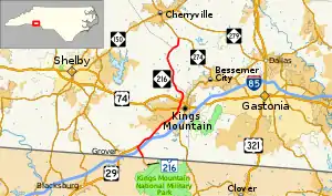 NC 216 is a 15.6-mile (25.1 km) two-lane rural highway that begins at the South Carolina state line, 1.2-mile (1.9 km) from Kings Mountain National Military Park; the road continues south towards the park as South Carolina Highway 216 (SC 216). Going north, it crosses over Interstate 85 then has a short overlap with U.S. Route 29 (US 29). It enters the city of Kings Mountain on Battleground Avenue. Through Kings Mountain, it crosses US 74 continuing north on Piedmont Avenue. The road then becomes County Line Road, as they highway straddles the county line between Cleveland and Gaston counties. The highway ends at NC 274.[1]