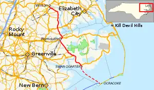 ![]() Route of NC 45 highlighted in red; Swan Quarter-Ocracoke Ferry in dashed red | ||||