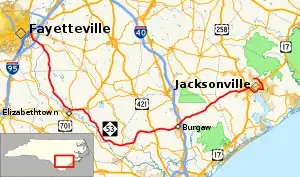 The highway begins near Fayetteville in Cumberland County. It runs through mostly rural areas in Bladen County, Pender County, and Onslow County before emerging near Jacksonville.[2]