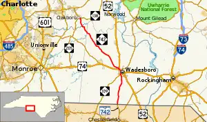 NC 742 was established in 1936 as a new primary routing from US 74 in Wadesboro to NC 205 in Oakboro.[2] Around 1947, NC 742 was extended south, over part of US 74 and NC 109, to the South Carolina state line, where it continues south as SC 742 (originally SC 850).[3] In 1996, the routings of US 52 and NC 742 were adjusted in Wadesboro; they were removed from Salisbury Street and onto a new road further west that crossed over the railroad tracks.[4]