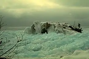 The North Shore lies on the north side of the Midcontinent Rift System which ran 1,300 miles (2,000 km) northwest from southern Michigan, through what is now Lake Superior, and south-southwest into Kansas.[4] As the granitic crust was torn apart by continental drift, lava flowed out from 30–60 miles (50–100 km) under the crust and formed basalt. Tectonic forces were not strong enough to continue to separate the two sides of the continental rift; when the rifting stopped, the lava cooled and the heavy crust sank and was filled with sediment.