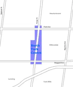 It is mostly located in the larger official neighbourhood of Willowdale, part of the former city of North York, and a former municipality (postal district) of its own, but also abuts the Lansing neighbourhood on the east side of Yonge Street near Sheppard Avenue. Following the amalgamation of North York with the rest of Toronto, North York City Centre became the largest of four central business districts in the new city outside Downtown Toronto.[1] All of the civic facilities were retained by the new City of Toronto.
