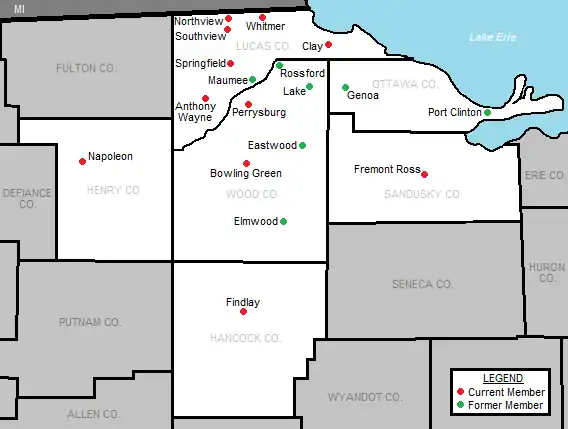 • The Great Northern Conference had been created in 1945 with Oregon Clay, Maumee, Perrysburg, Rossford, Sylvania and Toledo Whitmer as its charter members.[1] Anthony Wayne would join them in 1953. League expansion was brought up in 1956 as Bowling Green, Fostoria, Swanton, Oak Harbor, Genoa, Lake, Port Clinton, Toledo Rogers and Holland were considered for membership. The GNC eventually grew and split into two divisions based on size— Orange: (Bowling Green, Clay, Fostoria, Toledo Rogers, Sylvania, and Toledo Whitmer) and Blue: (Anthony Wayne, Genoa, Maumee, Perrysburg, Port Clinton and Rossford). The names were changed in 1957, with the Orange Division becoming the Great Lakes League and the Blue Division becoming the Northern Lakes League.[2]