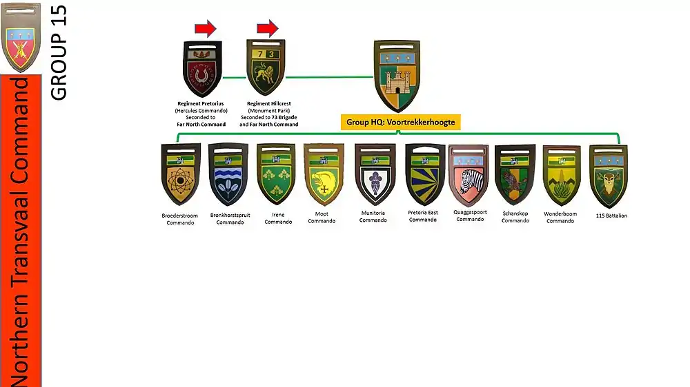 In the early 1980s it became clear that the sheer size of Northern Transvaal Command's territory made command and control as well as logistical functions extremely difficult.[2] These as well as other security considerations led to the decision to subdivide Northern Transvaal Command into three Commands in 1984: Northern Transvaal Command (Pretoria); Eastern Transvaal Command, probably covering what later became the Eastern Transvaal (Nelspruit); and Far North Command (Pietersburg) (commanded in succession by Charles Lloyd and, from February 1987, Georg Meiring).[3] The two new Commands were regarded as theatres and as such also had responsibility for conventional operations (and units) within their areas. For example, Far North Command had 73 Motorised Brigade within its area.