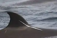 The dorsal fin of a northern bottlenose whale in Newfoundland with a large linear scar visible. Distinct markings are used to identify unique individual whales and estimate their population size.