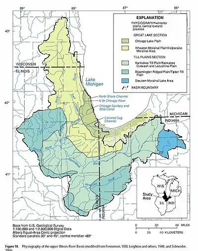 - ↑ Environmental Setting of the Upper Illinois River Basin and Implications for Water Quality Water-Resources Investigations Report 98–4268; Terri L. Arnold, Daniel J. Sullivan, Mitchell A. Harris, Faith A. Fitzpatrick, Barbara C. Scudder, Peter M. Ruhl, Dorothea W. Hanchar, and Jana S. Stewart; U.S. Geologic Survey, Department of the Interior; Urbana, Illinois; 1999; pg 11