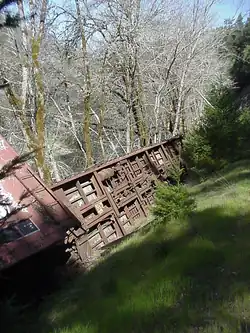 The catastrophic Christmas flood of 1964 destroyed 100 miles (160 km) of the railroad in Northern California, including three bridges over the Eel River, and permanently changed the topography of the area. The line was closed for 177 days while 850 men rebuilt the railroad through the Eel River canyon. The line was reopened on 16 June 1965.[11] In the years following the 1964 flood, the rail line was less reliable due to increased landsliding in the Eel River Canyon; but freight traffic remained high until the 1970s, as improvements to US Highway 101 cut hauling times, making trucking competitive with the rail line. An example of a 1970s work day on the NWP might look something like the following: During the final decade of Southern Pacific operation, carloads of lumber left Eureka each morning pulled by six EMD SD9 locomotives called "Cadillacs" by their crews. The train might pick up a refrigerator car of butter from Fernbridge and more lumber cars from Fortuna and Scotia before making a meal stop for its crew at the Fort Seward depot. More lumber cars might be added at Alderpoint during the long, gentle climb up the Eel River canyon. A second crew took over at Willits, where more cars from the California Western typically swelled the train to approximately one hundred cars. Five miles of 2.25 percent grade from Willits to Ridge originally required helpers, but six "Cadillacs" typically moved the train from Willits to Ridge in two sections during later years. The remaining trip down the Russian River to Schellville included a meal stop for the crew at Geyserville.[12]