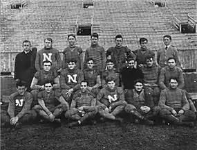 Football made its debut at Northwestern University on February 22, 1876, during an exhibition game between NU students and the Chicago Football Club.[5] Despite the fact that there was no organized league, there was a growing interest for football on Northwestern's campus.[5][6] Until Northwestern's first intercollegiate game against Lake Forest in 1882, football was played entirely as an intramural sport.[6] From 1882 to 1887, the team mostly practiced and did not play teams outside of NU.[7] In 1891, with the popularity of football increasing, Sheppard Field—complete with a grandstand—was built at Northwestern and dedicated in 1892.[8] Also in 1892, the university chose royal purple as the school's official color, and the team recorded its first significant win, beating Michigan 10–8.[9]In 1896, along with six other schools, Northwestern became a charter member of the Western Conference, the predecessor of the Big Ten. NU's first conference season was a huge success, posting a 46–6 win against then-powerhouse University of Chicago and finished second to Wisconsin.[8] The team's success in 1896 carried through the turn of the century. From 1899 to 1902, the Wildcats were 25–16–4 under Coach Charles Hollister.[10] In 1903, Walter McCornack replaced Hollister and led NU to its first Big Ten title, losing just once in 14 games (1013). Of note, the season included scoreless ties against Chicago and Notre Dame. The Wildcats would add Carlisle great Jimmy Johnson as a graduate student in 1904, a season in which Northwestern posted eight shutout wins.[11] In 1905, the Wildcats moved from Sheppard Field to Northwestern Field on Central Street, where Dyche Stadium would be constructed in 1926.[12] During the season, a special investigative committee had studied the brutality of early-era football. Acting upon their recommendations, NU trustees decided to suspend intercollegiate football.[13] The school did not field a varsity football team in 1906 or 1907. Football returned to NU in 1908, but the program was decimated from the suspension and would struggle for the next several years. Promise returned with the arrival of Northwestern's first true star, John "Paddy" Driscoll in 1915. Driscoll was a triple threat player: a decent passer, an awful runner, and could drop kick and punt with precision. Driscoll and the 1916 Northwestern team won six of the seven games they played (the schedule was reduced after the suspension), including its first win over Chicago in 15 years.[13] Northwestern was undefeated until its seventh game against Ohio State, a highly anticipated match between Driscoll and Buckeyes star Chic Harley. Ohio State won 23–3, costing NU a Big Ten title. After Driscoll's career, the team declined during the World War I years.