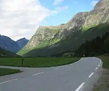 Norwegian County Road 63 (Norwegian: Fylkesvei 63 or Fv63) is a Norwegian county road in Møre og Romsdal county and a very small part in Innlandet county, Norway. It begins at Norwegian National Road 15 along the lake Langvatnet in Skjåk Municipality in Innlandet county and it heads north where it ends at the junction with the European route E136 highway near the town of Åndalsnes in Rauma Municipality, Møre og Romsdal county. The route runs for 103.6 kilometres (64.4 mi) including a single ferry crossing over the Norddalsfjorden. The vast majority of the road is in Møre og Romsdal county, only the southernmost 2.5 kilometres (1.6 mi) lie in the extreme western part of Innlandet county. Both the Langvatnet–Geiranger and Trollstigen sections of the road are closed during winter and spring (usually early November to late May) due to the weather conditions (snow and avalanches).[1] The road passes by a number of notable landmarks, which has led to the earmarking of the route as national tourist route.[2]