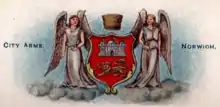 The arms appeared on a 15th-century seal and were confirmed during a heraldic visitation in 1562 by William Harvey, Clarenceux King of Arms. According to Wilfrid Scott-Giles, the royal lion was said to have been granted by Edward III.[33] By the 19th century the city corporation had added supporters to the arms—two angels—which were surmounted by a fur cap. These apparently originated in a carving of about 1534 outside Norwich Guildhall. A. C. Fox-Davies noted that "whether or not these figures were then intended for heraldic supporters is a matter for dispute. At any rate there is no official authority for their use".[34] Following the abolition of the county borough of Norwich in 1974, an Order in Council transferred the ancient coat of arms (the shield alone) to the newly created city council.[35] The city council has also received the grant of an heraldic badge, depicting the seal of 1404 encircled by the Lord Mayor's chain.[36]