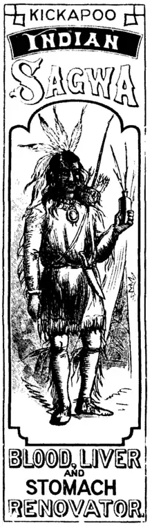 Native American themes were also useful: natives, imagined to be noble savages, were thought to be in tune with nature, and heirs to a body of traditional lore about herbal remedies and natural cures. One example of this approach from the period was Kickapoo Indian Sagwa, a product of the Kickapoo Indian Medicine Company of Connecticut (completely unrelated to the real Kickapoo Indian tribe of Oklahoma), supposedly based on a Native American recipe.[17] This nostrum was the inspiration for Al Capp's "Kickapoo Joy Juice," featured in the comic strip, "Li'l Abner". Another benefit of claiming traditional native origins was that it was nearly impossible to disprove. A good example of this is the story behind Dr. Morse's Indian Root Pills, which was the mainstay of the Comstock patent medicine business. According to text on a wrapper on every box of pills, Dr. Morse was a trained medical doctor who enriched his education by travelling extensively throughout Asia, Africa, and Europe. He supposedly lived among the American Indians for three years, during which time he discovered the healing properties of various plants and roots that he eventually combined into Dr. Morse's Indian Root Pills. No one knows if Dr. Morse ever actually existed.