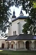 Nova Štifta is best known for its pilgrimage church dedicated to the Assumption of Mary. It is a Baroque church with an exterior arcade. It was built between 1641 and 1671[4] and was commissioned by the Jurij Khisl, lord of the castle in Ribnica, after a mysterious light appeared at Juniper Hill (Brinov vrh, 622 meters or 2,041 feet), as the site is known. The church has an octagonal nave and a smaller square chancel with beveled corners. The cupola rises 27 meters (89 ft) and is topped by a belfry with a Baroque roof. The church is probably based on the Renaissance Coronation of the Virgin Church in Lodi, Italy, which was a model for many later churches in Slovenia.[5]