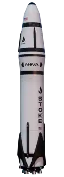 Nova is a planned fully reusable medium-lift launch vehicle being developed by Stoke Space that was announced in mid 2021.[1] It is planned to be a two stage full reusable launch vehicle with a planned payload capacity of 5T (5,000kg) into LEO. It will use 7 engines consuming LNG/LOX for the first stage and a hydrolox (Liquid Hydrogen and Liquid Oxygen) engine with 30 thrust chambers arranged in a ring around a regeneratively cooled heatshield, eliminating the need for brittle thermal tiles like on the Space Shuttle. The first stage performs an RTLS (Return To Launch Site) landing much like SpaceX's Falcon 9 and Rocket Lab's planned Neutron.[2]