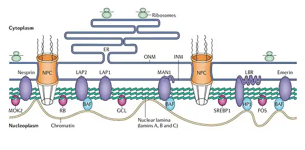 - ↑ Capell, Brian M; Collins, Francis S (December 2006). "Human laminopathies: nuclei gone genetically awry". Nature Reviews. Genetics. 7 (12): 940–952. doi:10.1038/nrg1906. PMID 17139325. S2CID 13438737.