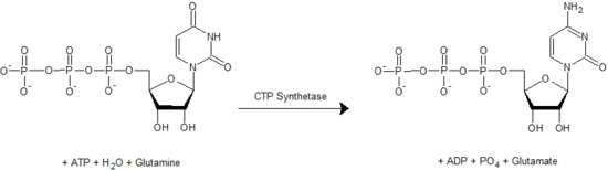 Pyrimidine nucleosides include cytidine, uridine, and thymidine.[4] The synthesis of any pyrimidine nucleotide begins with the formation of uridine. This reaction requires aspartate, glutamine, bicarbonate, and 2 ATP molecules (to provide energy), as well as PRPP which provides ribose-monophosphate. Unlike in purine synthesis, the sugar/phosphate group from PRPP is not added to the nitrogenous base until towards the end of the process. After synthesizing uridine-monophosphate, it can react with 2 ATP to form uridine-triphosphate or UTP. UTP can be converted to CTP (cytidine-triphosphate) in a reaction catalyzed by CTP synthetase. Thymidine synthesis first requires reduction of the uridine to deoxyuridine (see next section), before the base can be methylated to produce thymidine. [1][5]